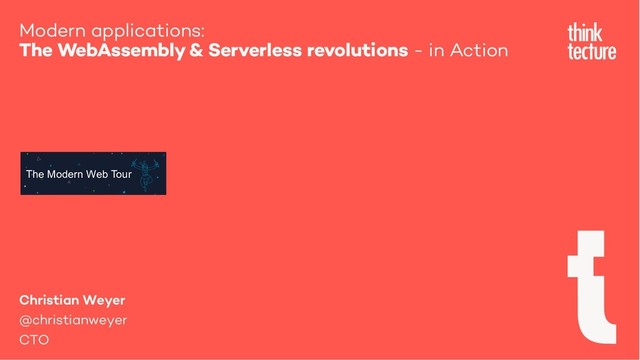 The landscape for modern software development is changing. There are new ways ahead to build real cross-platform, native-like web-based client applications together with lightweight Cloud architectures. In this session, Christian Weyer will look at these options and gives you a practical introduction to the techniques and technologies that may shape your application's future. Come and feel the potential of WebAssembly and Serverless computing in Azure - in action!