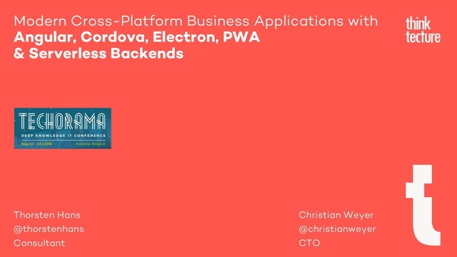 Modern business applications are facing entirely different challenges today. End-users are used to just leverage their mobile phone, tablets, laptops and (maybe) desktop computers. Applications, data and processes just need to work, just need to “be there” – regardless of the application hosting and provisioning model. Developers should realize these ever-changing challenges and should address possible approaches for ubiquitous solutions. In this full-day workshop, Thorsten and Christian from Thinktecture show you a way how to design, architect, implement and run modern business applications – end-to-end. Come and see how to provide lightweight APIs into your business processes via Serverless technolgoies and architectures in Azure. Feel the power of real-cross platform HTML5 SPAs – e.g. based on Angular – to offer a use-case-optimized user experience across all platforms on any devices and runtimes. Let’s start with Angular web applications for the browser and augment them to have native functionalities on the mobile platforms with Apache Cordova and on desktop operating systems with GitHub Electron. Last but not least, join us for a sneak preview into a hopefully not too disitant future: Progressive Web Apps (PWA) could be the ever-lasting ultimate app model for everybody. Apps without the need to install, just running inside the browser engines with power to interact natively. Sounds too good? Let’s see – all this in action!