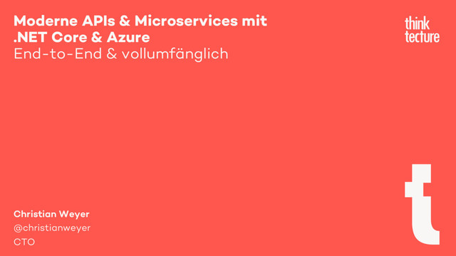 Na, dann wollen wir mal! In diesem Workshop wird Christian Weyer mit einer fast leeren Visual Studio Solution beginnen und ein (halbwegs ) realistisches Microservices-Szenario auf Basis von Web APIs & Push Services bauen – aber End-to-End. Denn was bringen uns isolierte Services & APIs jenseits jeglicher Anwendungsfälle? Nichts, oder? Über Use-Case-Formulierung, API Design & API Dokumentation, Absicherung von APIs bis hin zu Client-Anwendungen werden wir einen wilden Ritt durch zahlreiche .NET Core Klassen & Frameworks unternehmen und diverse Tools unter die Lupe nehmen, die unser Leben einfacher machen sollen. Lernen Sie ASP.NET Core MVC-basierte Web APIs in Aktion kennen und genießen Sie wie einfach man Realtime-Kommunikation mit ASP.NET Core SignalR – in Verbindung mit Message Queueing zur Entkopplung der Services – umsetzen kann. Das Ganze wird komplettiert mit einer echt Cross-Plattform-fähigen Client-Anwendung für den Browser, mobile Geräte und allen Desktop-Betriebssystem auf Basis von Angular. Und zu guter Letzt: ab damit in die Azure Cloud! Let’s rock and roll – von Null auf Hundert.