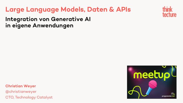 Menschliche Sprache als Universal Interface für Software-Lösungen - hört sich spannend an! Jenseits des ChatGPT-Hypes taucht Christian in die Welt der Large Language Models (LLMs), Daten und APIs ein und konzentriert sich darauf, wie man AI-Funktionalität sinnvoll in eigene Anwendungen integrieren kann. Wir werden pragmatische Szenarien und Use Cases untersuchen, die das Potenzial von LLMs (wie GPT oder Llama) demonstrieren - und erörtern, wie AI-Techniken in bestehende Architekturen einbezogen werden können. Die Teilnehmer erhalten erste Einblicke in Frameworks wie LangChain aus der Python-Welt zur Programmierung LLM-basierter Systeme. Zudem werden wir darauf eingehen, nicht nur Closed-Source-Systeme (wie OpenAI) zu nutzen, sondern auch Open-Source-Optionen (wie Llama) in Betracht zu ziehen, um unterschiedlichen Anforderungen gerecht werden zu können.