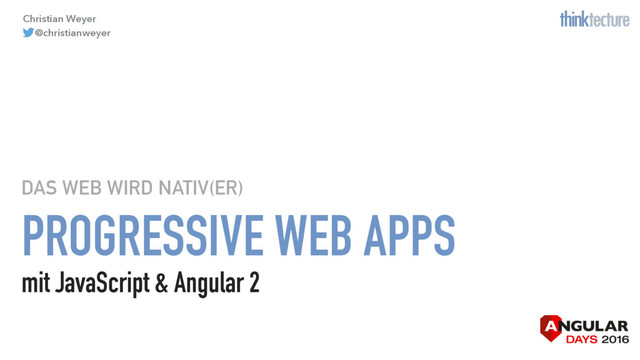 Mobilen Web Apps wird ja immer nachgesagt, dass sie zu viel Web und zu wenig Apps sind – sich also zu wenig nativ anfühlen. Mit Progressive Web Apps (PWA) lassen sich solche Anwendungen mit einigen zentralen und relevanten nativen Features ausstatten: Offline-Fähigkeit, Push Notifications, schnelles Startverhalten und installierbar mitsamt Home Screen Icon. Christian Weyer zeigt Ihnen wie man mit Angular 2 solche PWAs erstellt und wie sie sanft und sachte die Schlucht zwischen reinen Web-Sites, Web Apps und hybriden/nativen Apps schließen können. Und all das idealerweise ohne native App-Rahmen, sondern basierend auf Web- und Browser-Standards – wenn sie denn unterstützt werden. Lassen Sie uns gemeinsam das Beste aus der nativen und der Web -Welt zusammenführen!