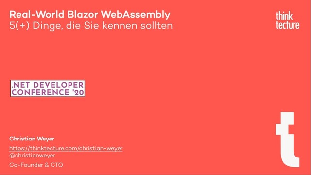 @christianweyer [email protected] Demos: https://github.com/thinktecture/blazor-wasm-things-to-know https://github.com/thinktecture/blazor-webassembly-demo Artikel zu Blazor, PWA, Web Components, Angular, .NET Core & mehr: https://thinktecture.com/de/newsletter