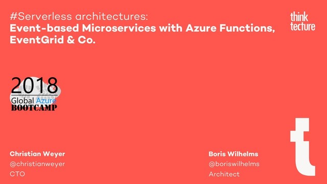 Whaaat? No servers? Well, yes. The Serverless approach for building microservices promises to offer a low entry barrier - for both getting starting and for fulfilling a target. In this session Christian & Boris will show you end-to-end Serverless with Azure & ..NET/NET Core by means of a realistic application scenario from customer projects. Based on proven design patterns you can build simple & complex applications scenarios with Azure Functions, Azure Event Grid, Azure Cosmos DB, Azure Storage & friends. Locally and in the cloud. One of the central key concepts here is thinking in events in order to trigger actions like sending messages, retrieving data or pushing information to destinations. Come and join this session, maybe you will face some new ideas for your future business software.