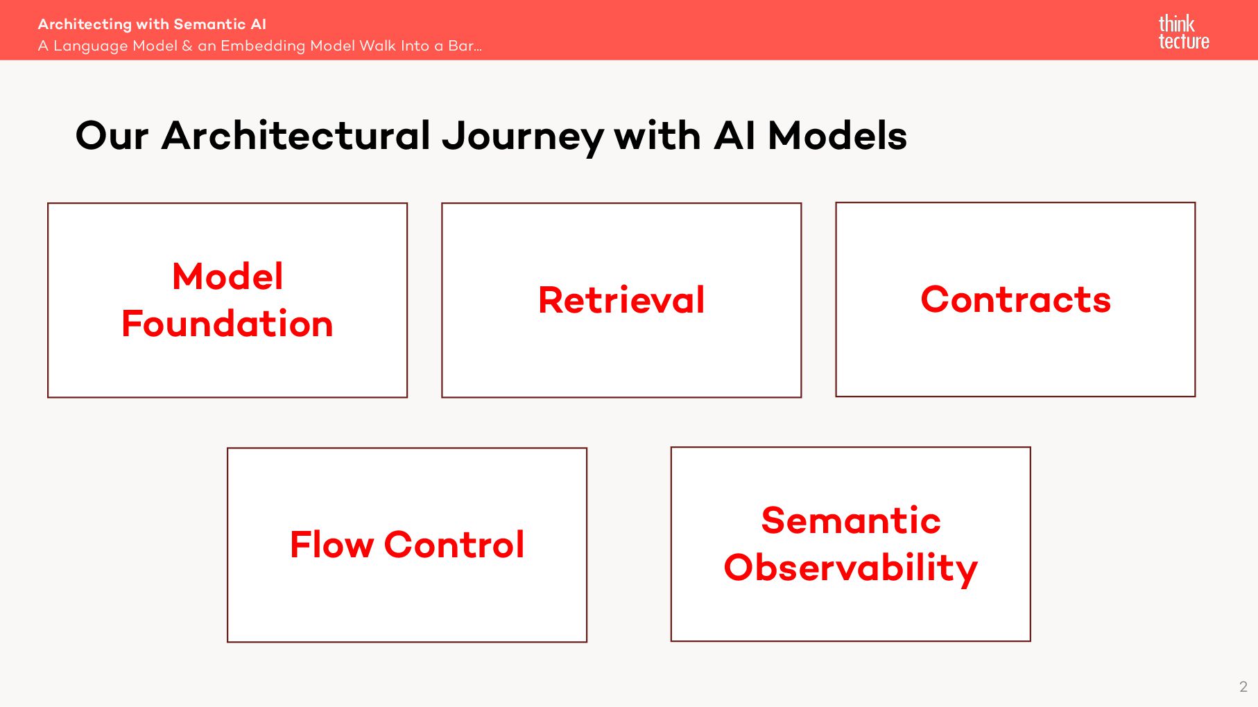 Model Walk Into a Bar... Our Architectural Journey with AI Models 2 Model Foundation Retrieval Flow Control Semantic Observability Contracts