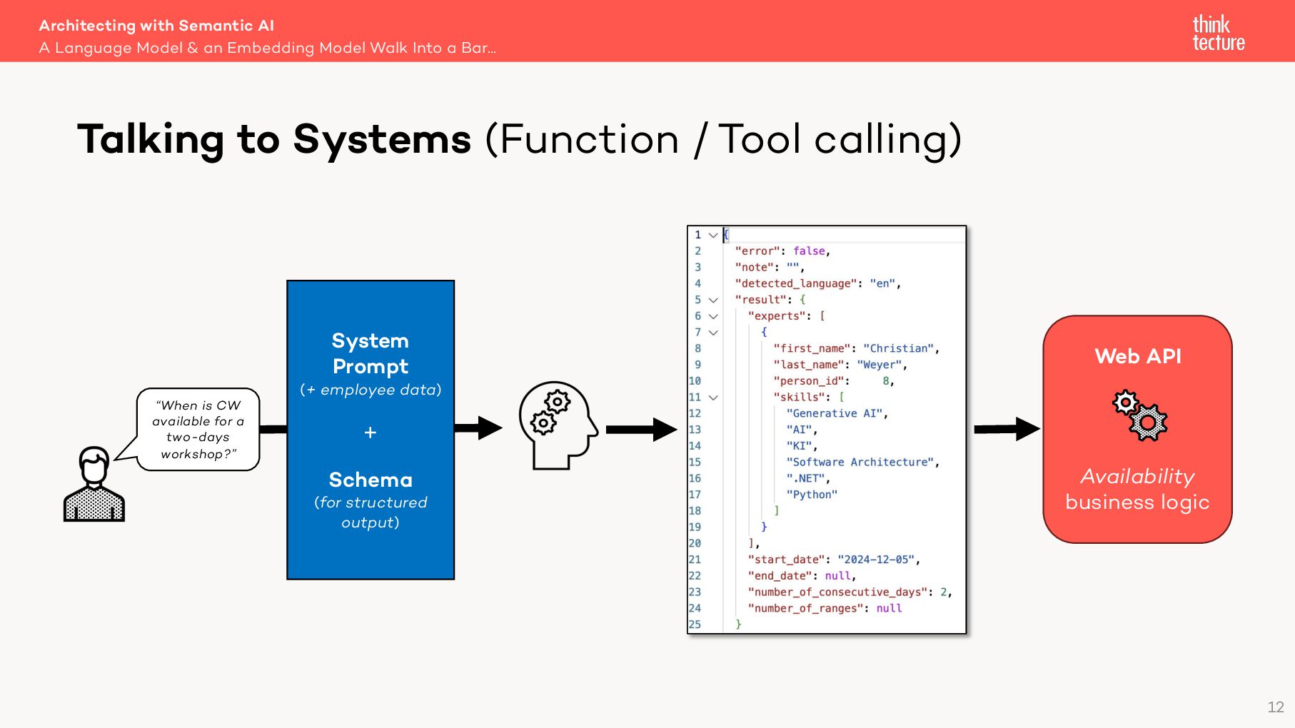Model Walk Into a Bar... Talking to Systems (Function / Tool calling) “When is CW available for a two-days workshop?” System Prompt (+ employee data) + Schema (for structured output) Web API Availability business logic 12