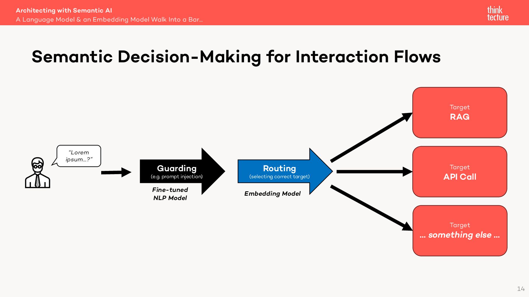 Model Walk Into a Bar... Semantic Decision-Making for Interaction Flows Guarding (e.g. prompt injection) Routing (selecting correct target) “Lorem ipsum…?” Target RAG Target API Call Target … something else … Fine-tuned NLP Model Embedding Model 14