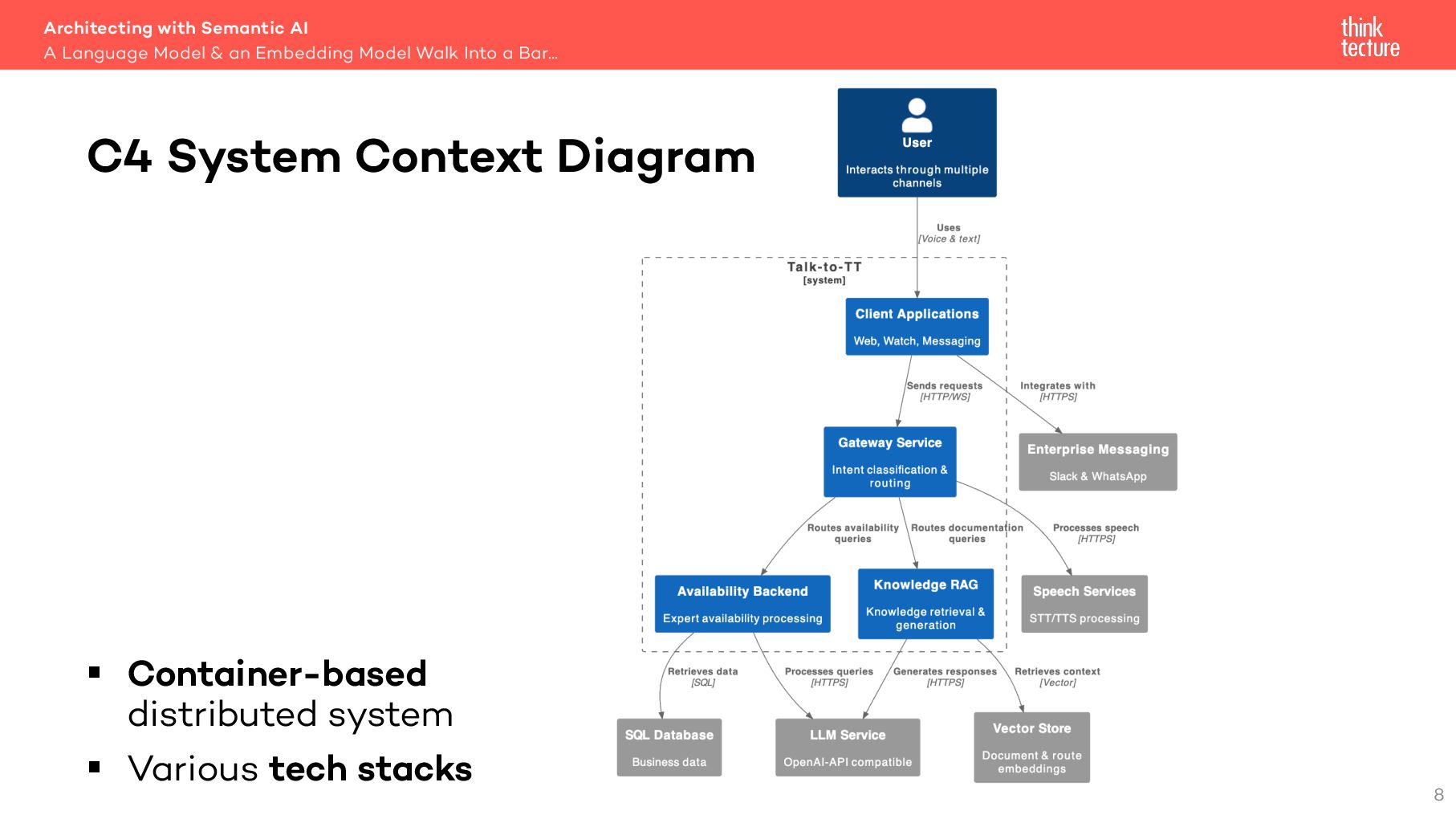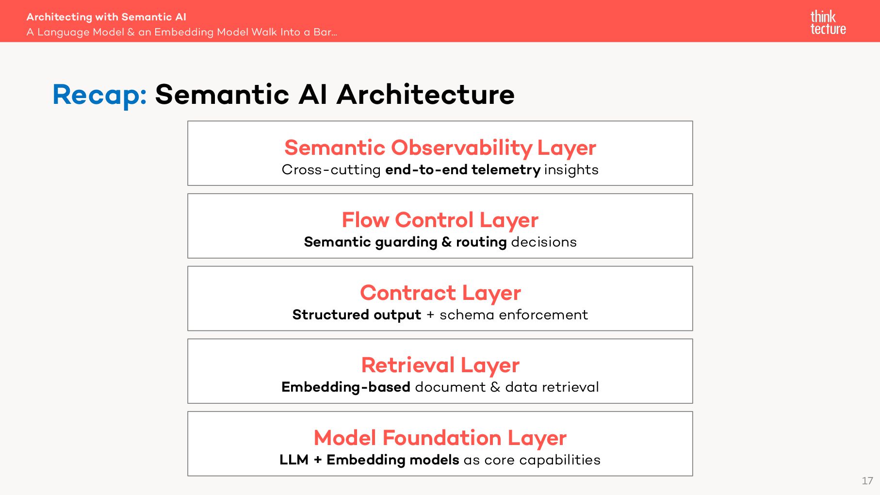 Semantic guarding & routing decisions Contract Layer Structured output + schema enforcement Retrieval Layer Embedding-based document & data retrieval Model Foundation Layer LLM + Embedding models as core capabilities Recap: Semantic AI Architecture A Language Model & an Embedding Model Walk Into a Bar... Architecting with Semantic AI 17