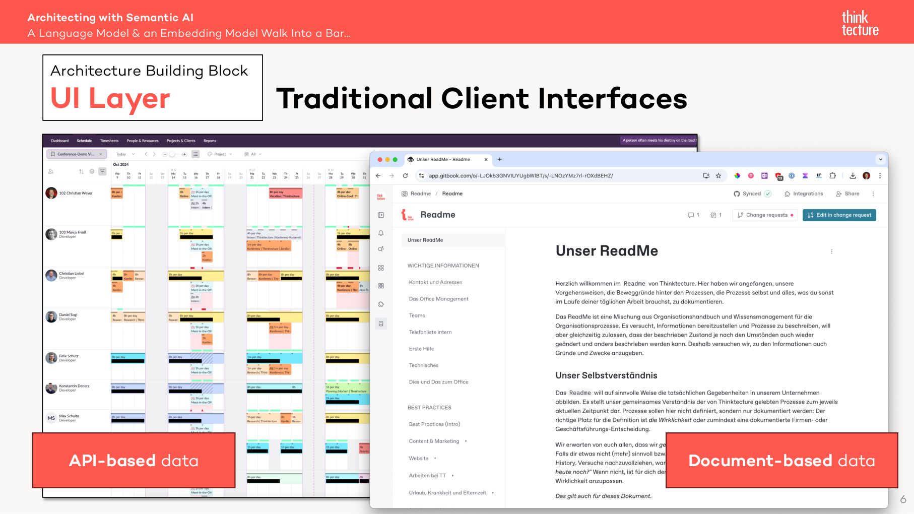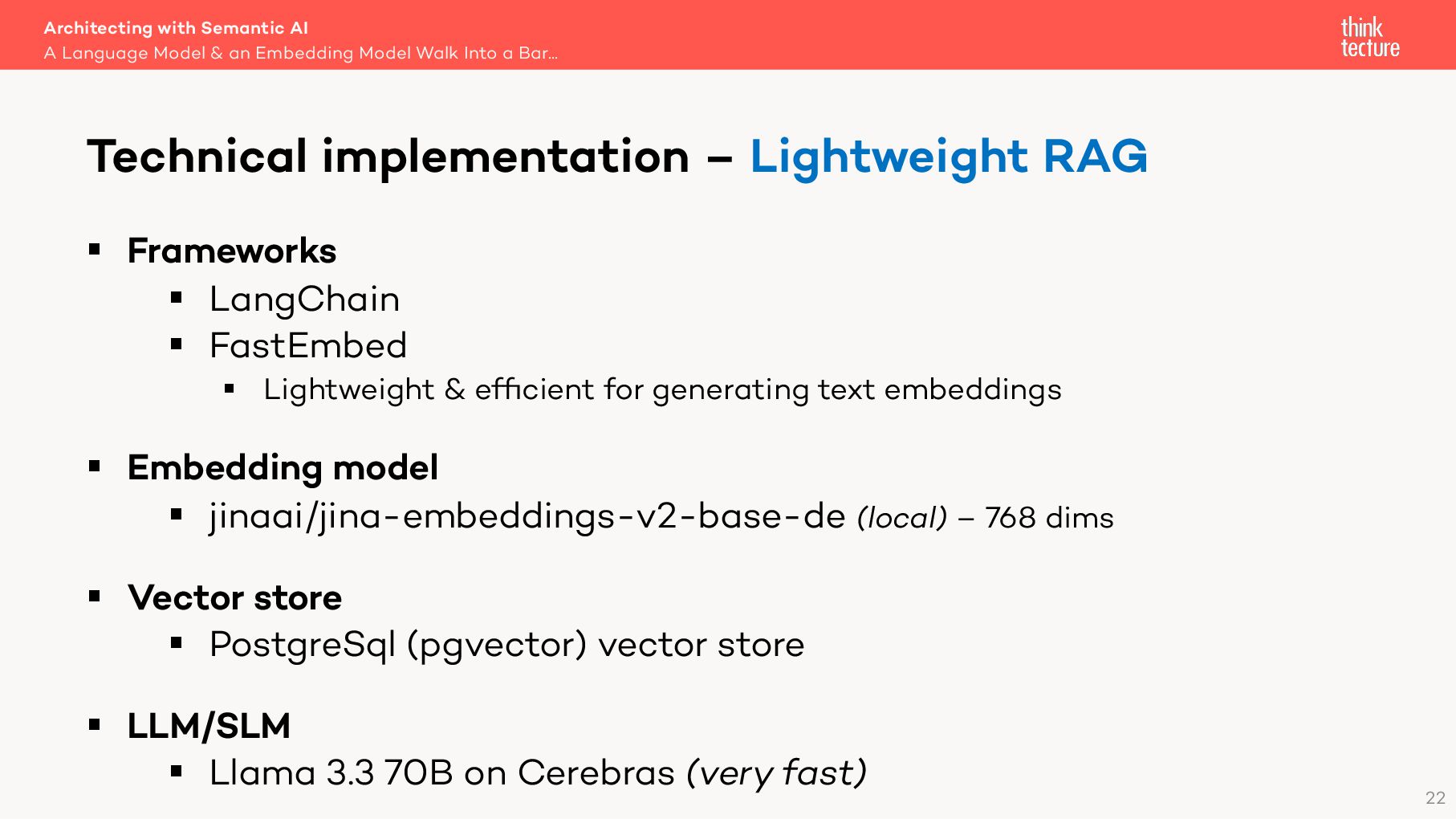 for generating text embeddings § Embedding model § jinaai/jina-embeddings-v2-base-de (local) – 768 dims § Vector store § PostgreSql (pgvector) vector store § LLM/SLM § Llama 3.3 70B on Cerebras (very fast) Architecting with Semantic AI A Language Model & an Embedding Model Walk Into a Bar... Technical implementation – Lightweight RAG 22