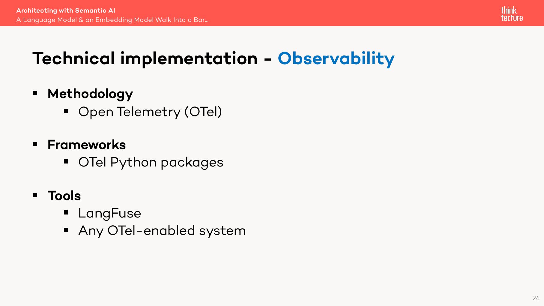 Python packages § Tools § LangFuse § Any OTel-enabled system Architecting with Semantic AI A Language Model & an Embedding Model Walk Into a Bar... Technical implementation - Observability 24