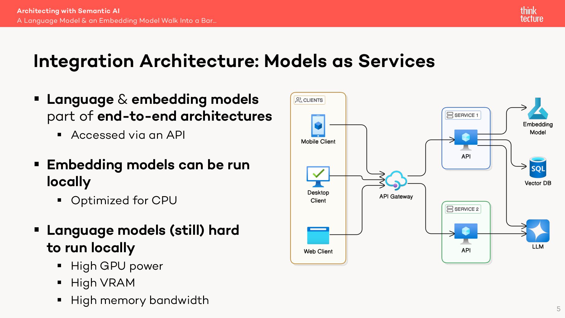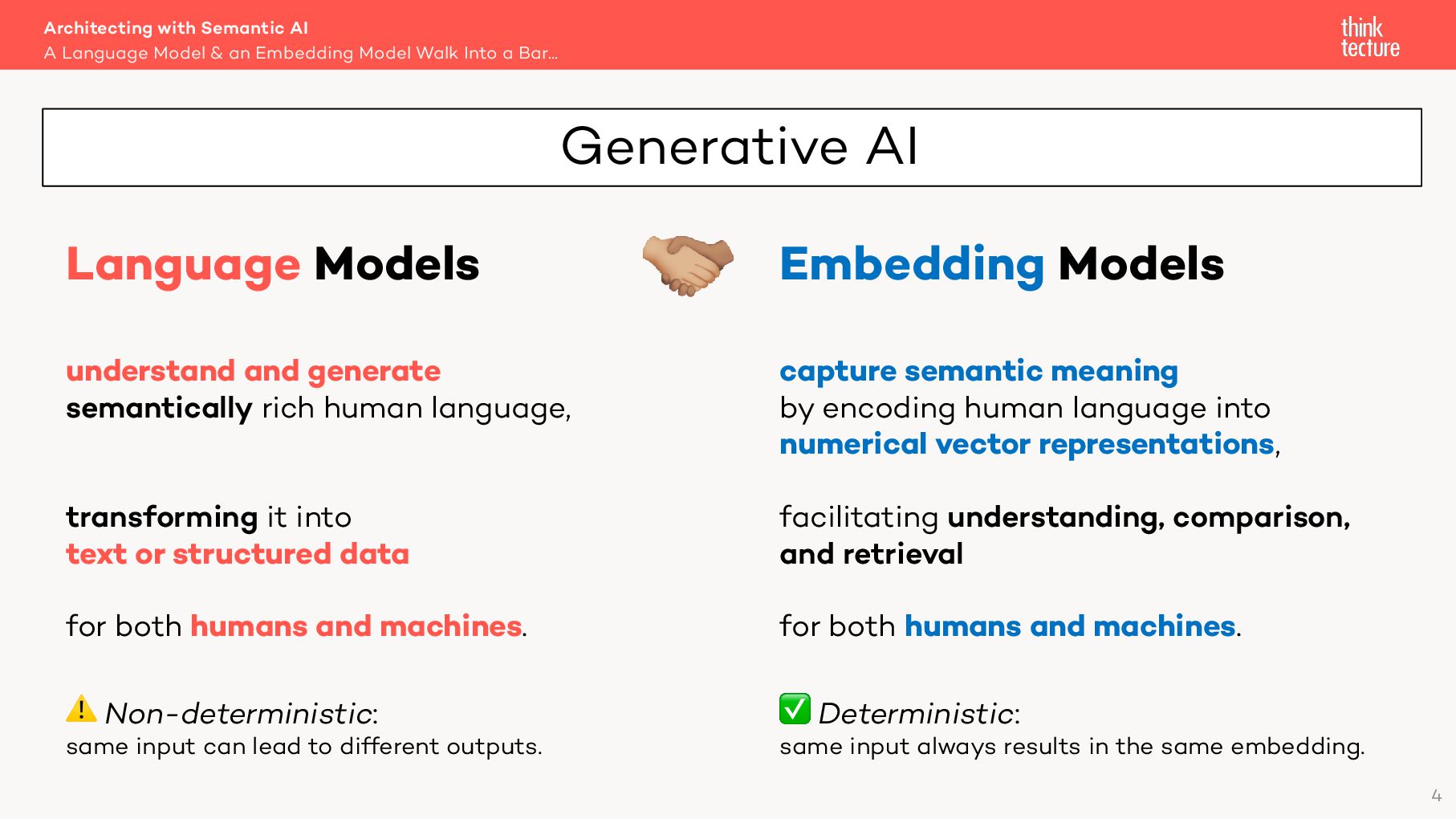 it into text or structured data for both humans and machines. ⚠ Non-deterministic: same input can lead to different outputs. Embedding Models capture semantic meaning by encoding human language into numerical vector representations, facilitating understanding, comparison, and retrieval for both humans and machines. ✅ Deterministic: same input always results in the same embedding. Architecting with Semantic AI A Language Model & an Embedding Model Walk Into a Bar... 🫱 🫲 Semantic AI Generative AI 4