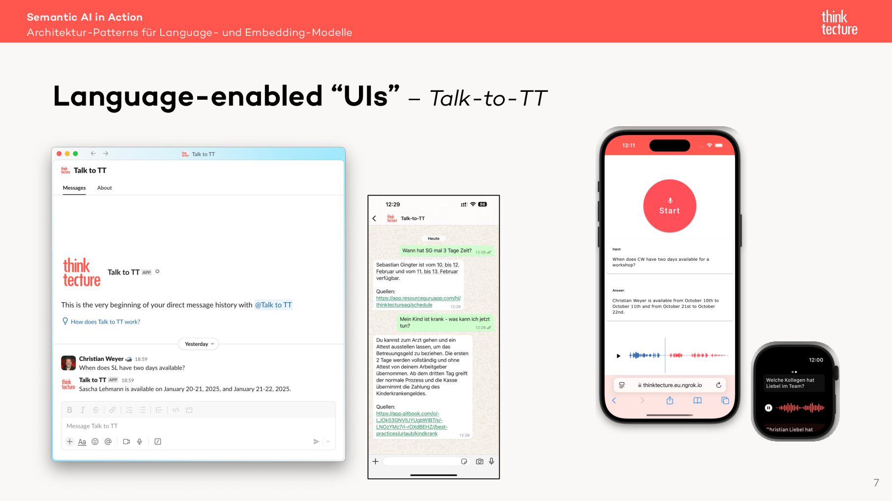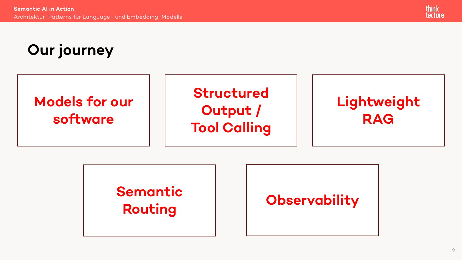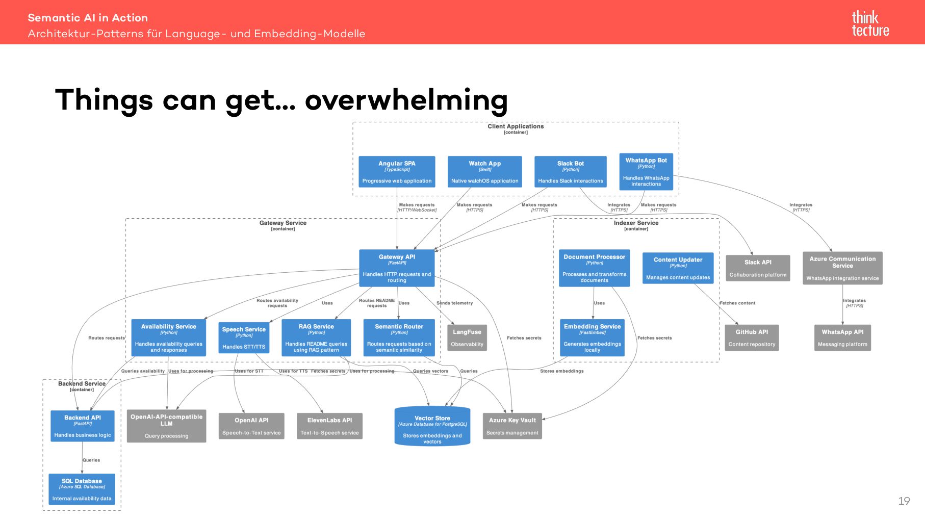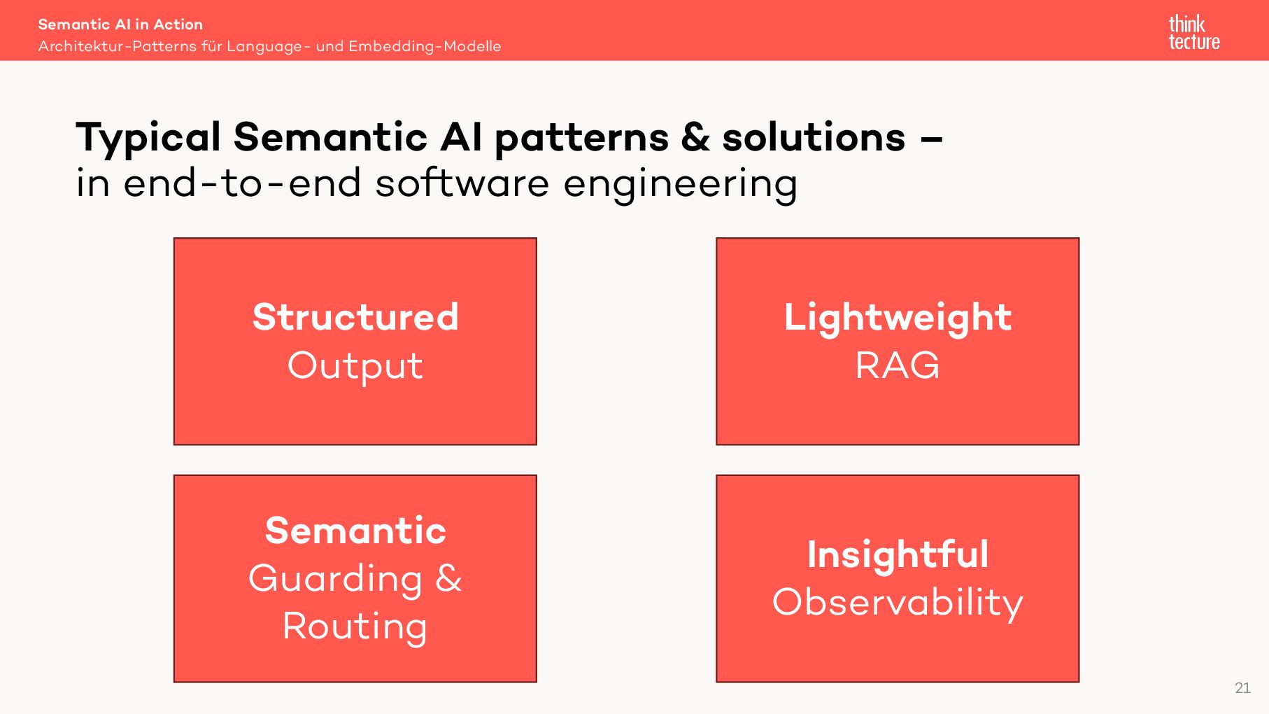 Semantic AI als Weiterentwicklung von Generative AI kann der Schlüssel zur Integration von KI in eigene Lösungen sein. In diesem Vortrag zeigt Christian Weyer praxisnahe Architektur-Patterns und Ansätze für die Nutzung von Large und Small Language Models wie GPT oder Llama sowie Embedding-Modellen in modernen Softwarearchitekturen. Wichtige Konzepte wie Semantic Routing, Semantic Search und RAG, Structured Output und Observability werden anhand eines End-to-End-Systems mit mehreren Services und Clientanwendungen demonstriert. Entwickler und Architekten erhalten einen pragmatischen Überblick über die mögliche Umsetzung in eigenen Projekten.