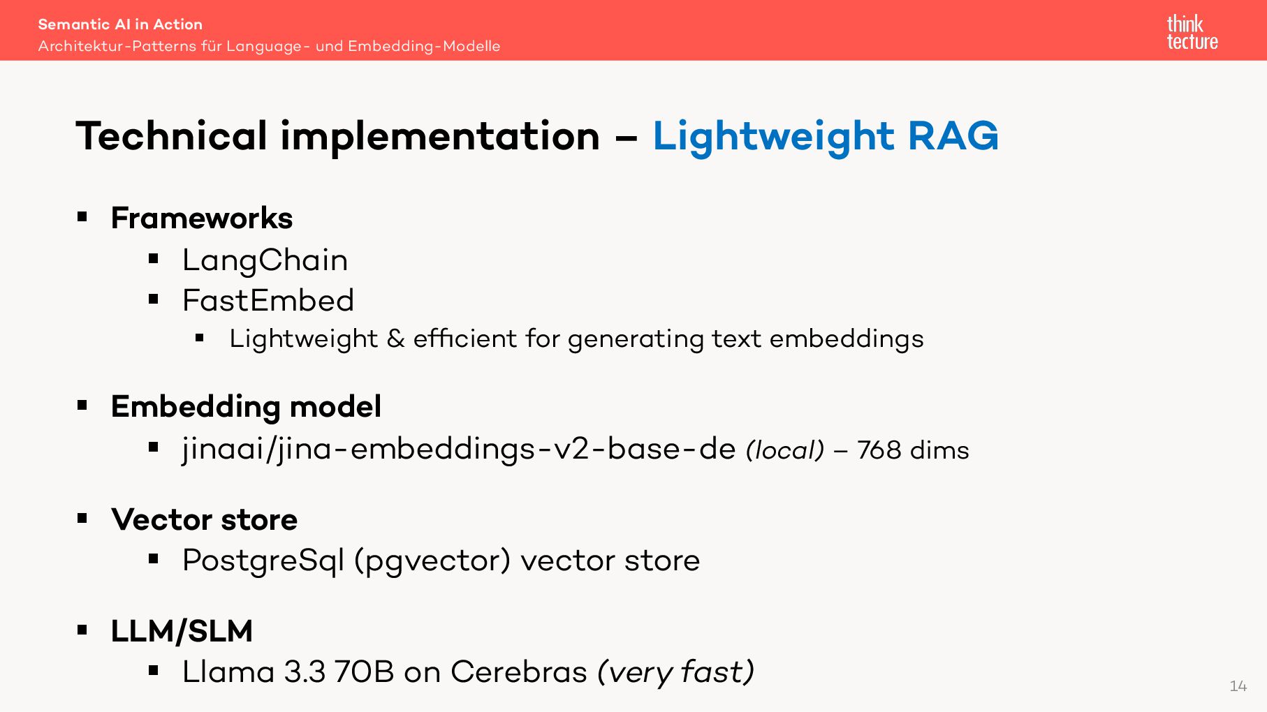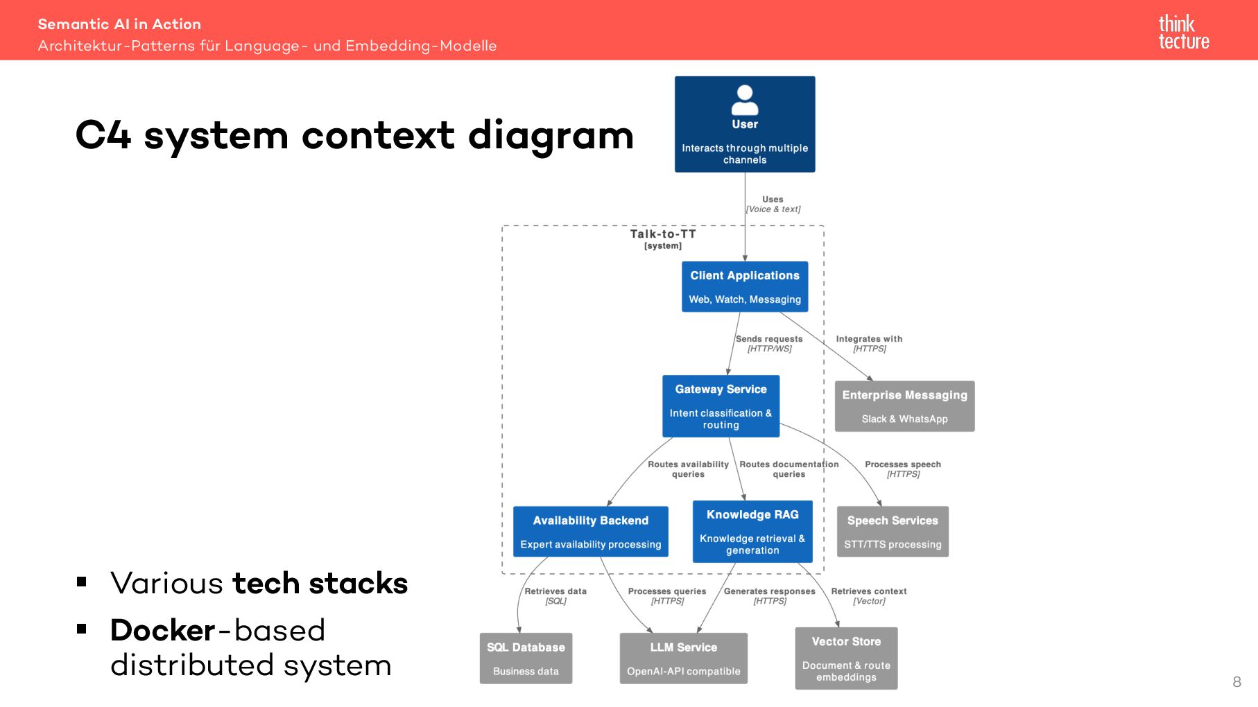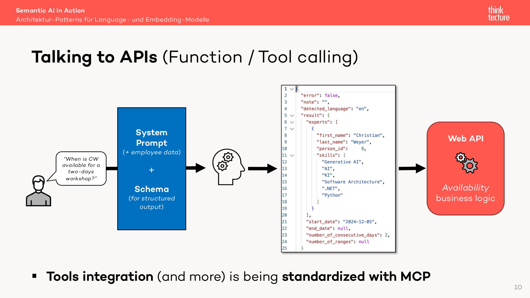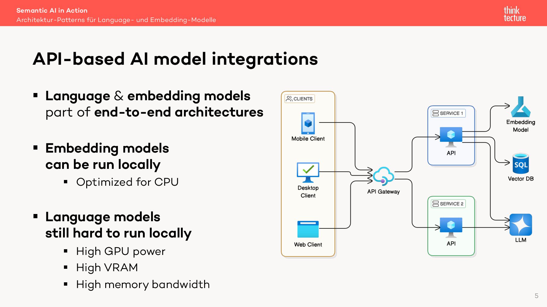 Semantic AI als Weiterentwicklung von Generative AI kann der Schlüssel zur Integration von KI in eigene Lösungen sein. In diesem Vortrag zeigt Christian Weyer praxisnahe Architektur-Patterns und Ansätze für die Nutzung von Large und Small Language Models wie GPT oder Llama sowie Embedding-Modellen in modernen Softwarearchitekturen. Wichtige Konzepte wie Semantic Routing, Semantic Search und RAG, Structured Output und Observability werden anhand eines End-to-End-Systems mit mehreren Services und Clientanwendungen demonstriert. Entwickler und Architekten erhalten einen pragmatischen Überblick über die mögliche Umsetzung in eigenen Projekten.