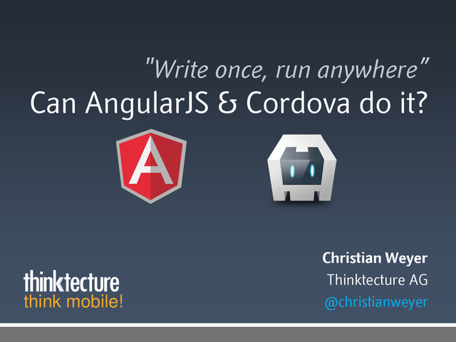 It is no longer a secret that we can build real applications – not just web sites – with HTML5 and JavaScript. With client programming frameworks like AngularJS software developers have a means to think and act in proven design patterns and craft there user interfaces and client-side logic with javaScript without always having to deal with the burden of the language. With a grain of tooling and additional APIs we can even go a step further and provide native apps for each and every platform out there – especially the mobile ones. Christian Weyer will show you how to use AngularJS and the Apache Cordova ecosystem to build apps for Windows, iOS, Android, and Windows Phone with just a single codebase. Really?!