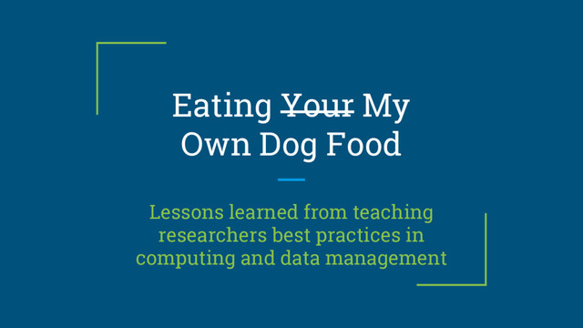 experience: big picture ideas and best practices from Software and Data Carpentry that I have found helpful in my own work Adoption • Find a new tool or idea that you could use to improve your work Application • Connect this “best practices” thinking with your own processes
