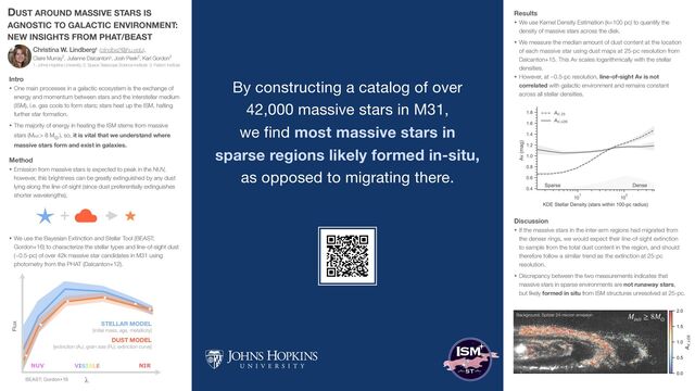 the exchange of energy and momentum between stars and the interstellar medium (ISM), i.e. gas cools to form stars; stars heat up the ISM, halting further star formation. ✦ The majority of energy in heating the ISM stems from massive stars (Minit > 8 M ), so, it is vital that we understand where massive stars form and exist in galaxies. Method ✦ Emission from massive stars is expected to peak in the NUV, however, this brightness can be greatly extinguished by any dust lying along the line-of-sight (since dust preferentially extinguishes shorter wavelengths). ✦ We use the Bayesian Extinction and Stellar Tool (BEAST; Gordon+16) to characterize the stellar types and line-of-sight dust (~0.5-pc) of over 42k massive star candidates in M31 using photometry from the PHAT (Dalcanton+12). ⊙ By constructing a catalog of over 42,000 massive stars in M31, we find most massive stars in sparse regions likely formed in-situ, as opposed to migrating there. DUST AROUND MASSIVE STARS IS AGNOSTIC TO GALACTIC ENVIRONMENT: NEW INSIGHTS FROM PHAT/BEAST Christina W. Lindberg1 (
