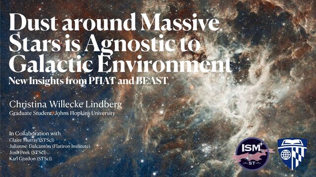 et al. (2024) https://arxiv.org/abs/2401.10991 1. Identified over 42,000 main-sequence massive star candidates in the PHAT region of M31 using broadband photometry (Dalcanton+12) characterized by the BEAST (Gordon+16), available at https:// archive.stsci.edu/hlsp/phathighmass. 2. At 25-pc resolution, Av is correlated with galactic environment 3. At ~0.5-pc resolution, line-of-sight Av is not correlated with galactic environment and remains constant across all disk environments 4. Discrepancy between the two measurements indicates that massive stars in sparse environments are not runaway stars, but likely formed in situ from ISM structures unresolved at 25-pc 5. Future: Study can be repeated for any galaxies with broad photometric coverage (i.e. SMC/LMC, M33, etc.) Resolving Galaxy Ecosystems 12-15-2023 Christina Willecke Lindberg (
