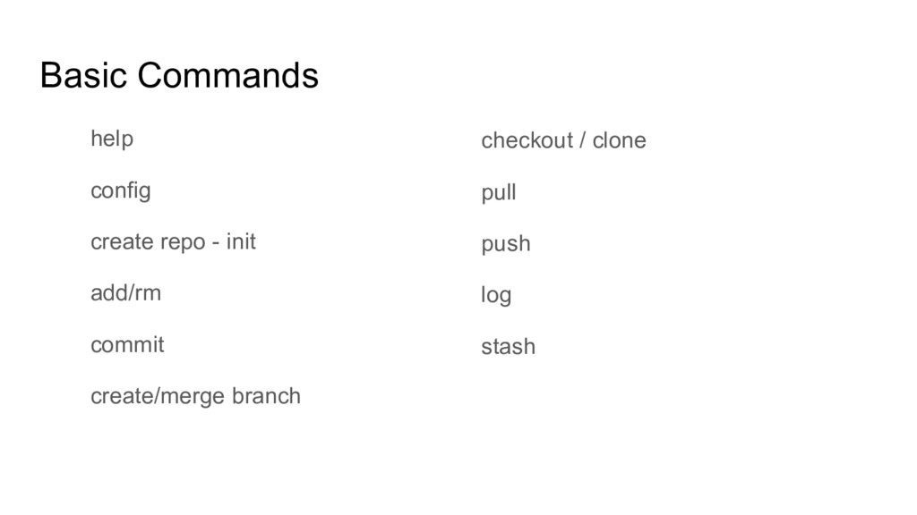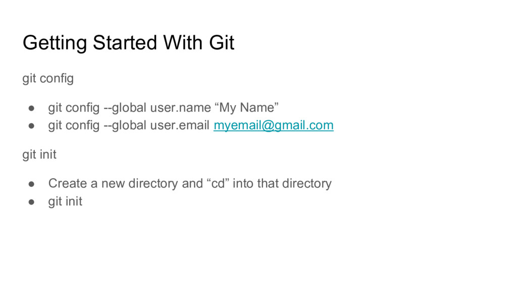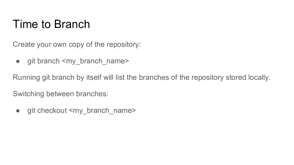 • git branch <my_branch_name> Running git branch by itself will list the branches of the repository stored locally. Switching between branches: • git checkout <my_branch_name>