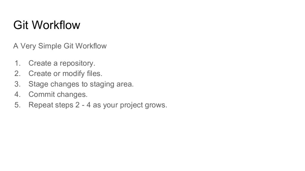 Git Workflow: 1. Clone a repository from a remote site. 2. Create a branch to work on your own copy of the code. 3. Make changes to the code base. 4. Merge the trunk (master) into your branch 5. Test the code base to verify your work. 6. Repeat steps 3 through 5 until you feel that your work is complete. 7. Merge your branch back into master.