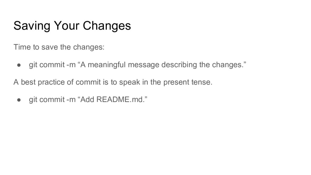 • Create a file or directory in your repository (README.md) • git add <name of file/directory just created> Removing from a repository • git rm <name of file/directory no longer needed> • Remove the file or directory that you just removed from the repository. You must remember to re-add files that you have changed to the repository.