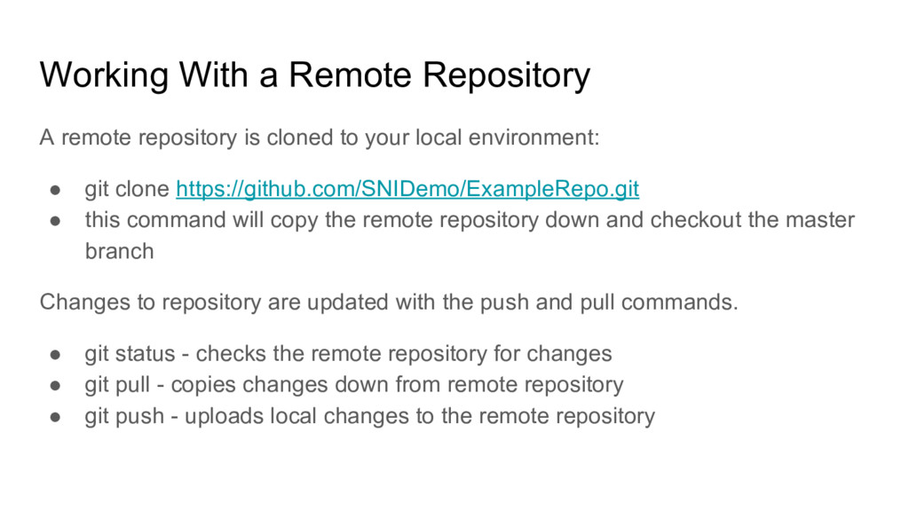 to your local environment: • git clone https://github.com/SNIDemo/ExampleRepo.git • this command will copy the remote repository down and checkout the master branch Changes to repository are updated with the push and pull commands. • git status - checks the remote repository for changes • git pull - copies changes down from remote repository • git push - uploads local changes to the remote repository