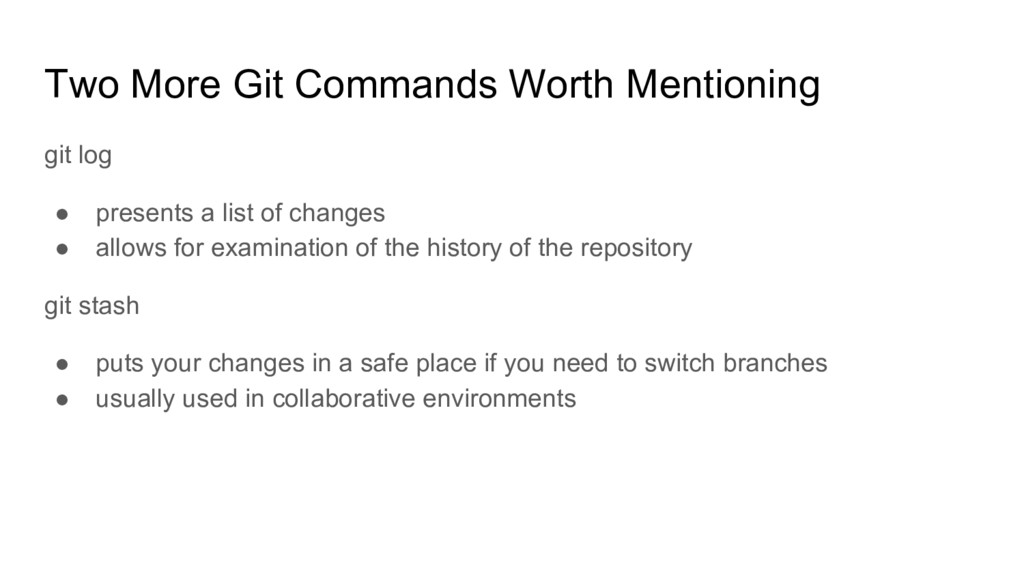 a list of changes • allows for examination of the history of the repository git stash • puts your changes in a safe place if you need to switch branches • usually used in collaborative environments