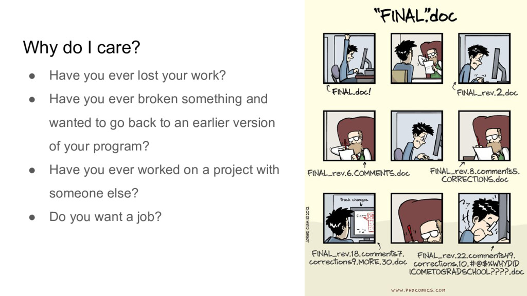 work? • Have you ever broken something and wanted to go back to an earlier version of your program? • Have you ever worked on a project with someone else? • Do you want a job?