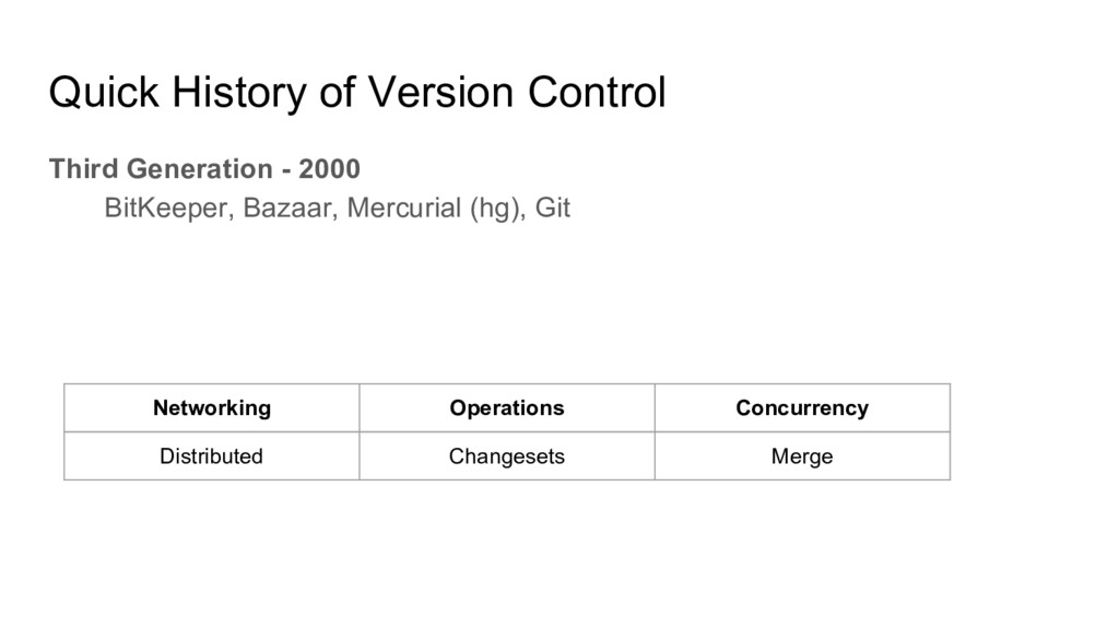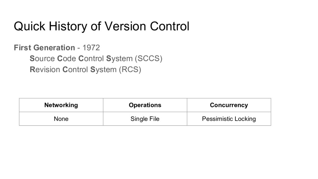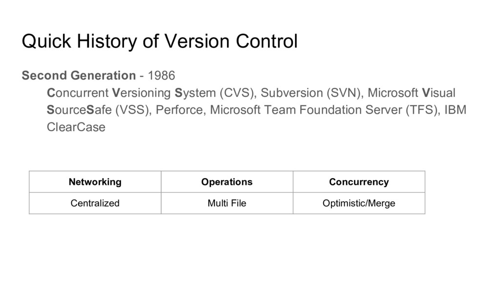 Microsoft Visual SourceSafe (VSS), Perforce, Microsoft Team Foundation Server (TFS), IBM ClearCase Quick History of Version Control Networking Operations Concurrency Centralized Multi File Optimistic/Merge