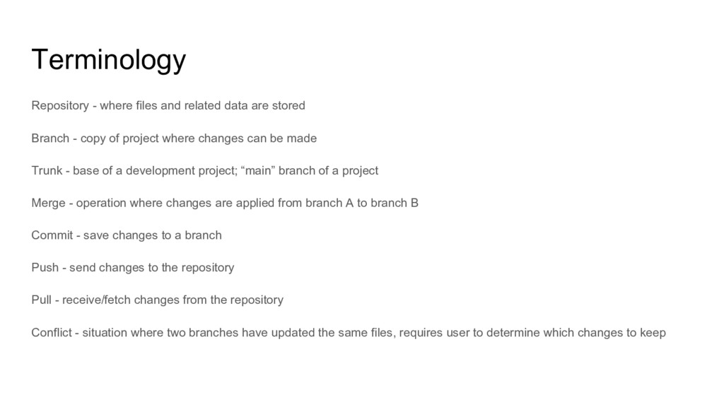 Branch - copy of project where changes can be made Trunk - base of a development project; “main” branch of a project Merge - operation where changes are applied from branch A to branch B Commit - save changes to a branch Push - send changes to the repository Pull - receive/fetch changes from the repository Conflict - situation where two branches have updated the same files, requires user to determine which changes to keep