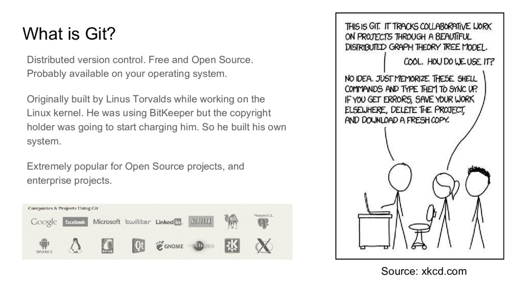 Probably available on your operating system. Originally built by Linus Torvalds while working on the Linux kernel. He was using BitKeeper but the copyright holder was going to start charging him. So he built his own system. Extremely popular for Open Source projects, and enterprise projects. Source: xkcd.com