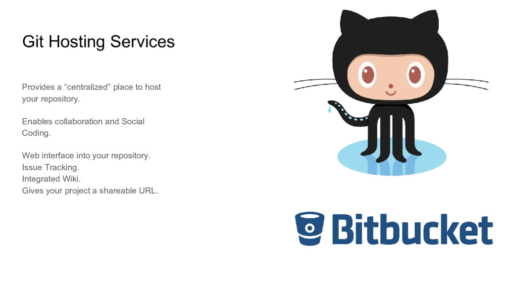 repository. Enables collaboration and Social Coding. Web interface into your repository. Issue Tracking. Integrated Wiki. Gives your project a shareable URL.