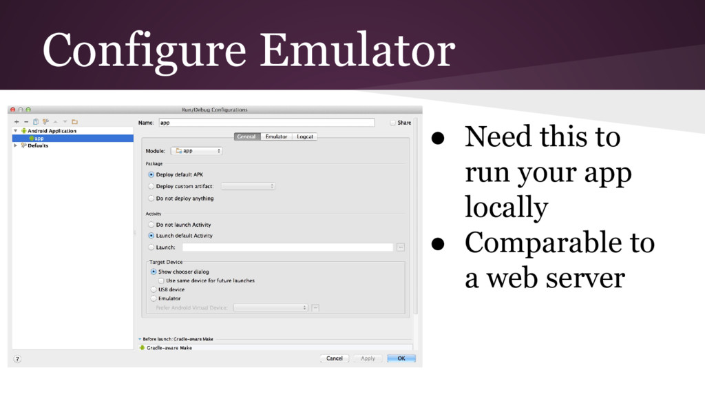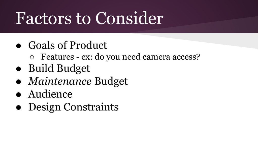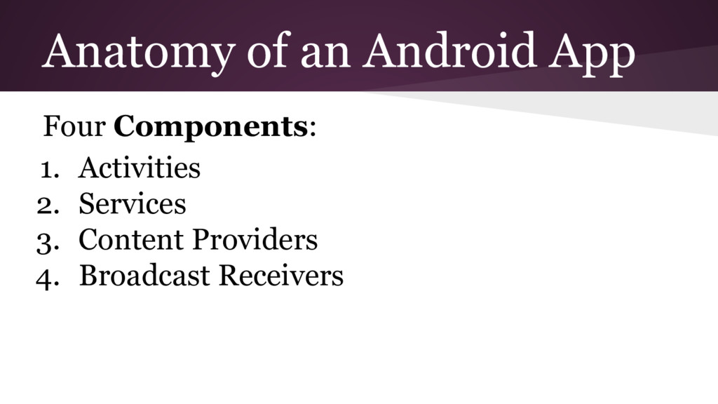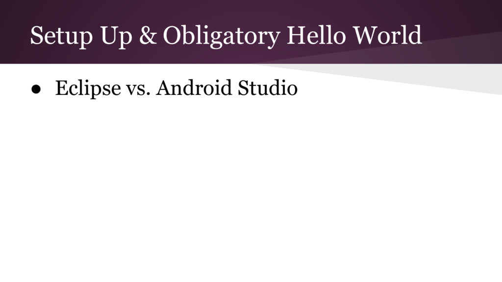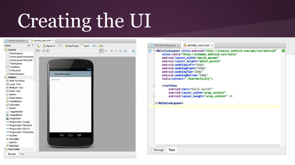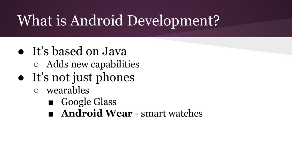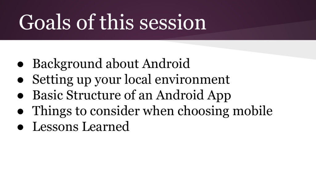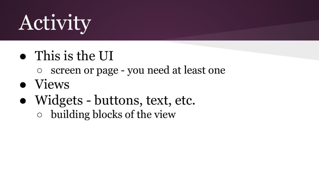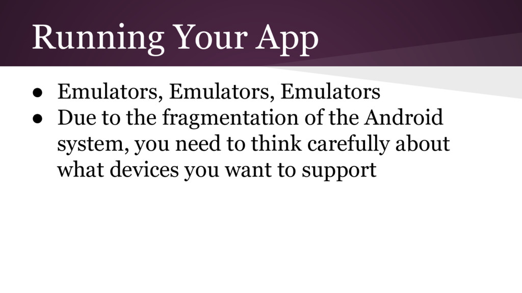 Mobile is a different way of thinking about the user’s actions and goal of the program ◦ This makes it everything feel foreign while getting started, but does pass • Use Android’s online tutorials