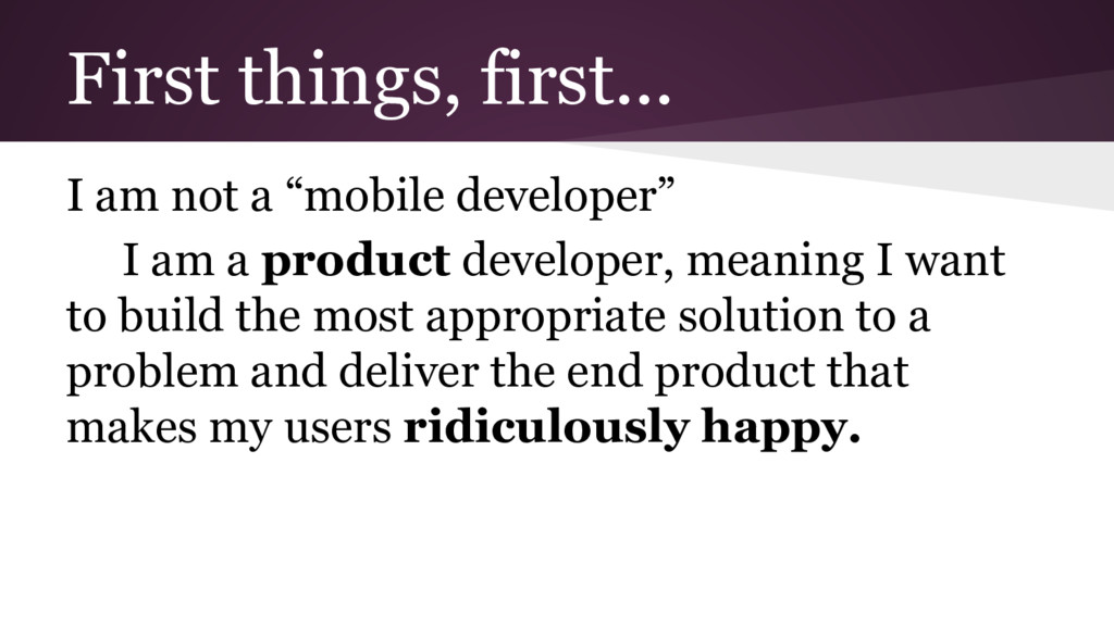 am a product developer, meaning I want to build the most appropriate solution to a problem and deliver the end product that makes my users ridiculously happy.