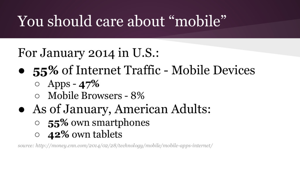 • 55% of Internet Traffic - Mobile Devices ◦ Apps - 47% ◦ Mobile Browsers - 8% • As of January, American Adults: ◦ 55% own smartphones ◦ 42% own tablets source: http://money.cnn.com/2014/02/28/technology/mobile/mobile-apps-internet/