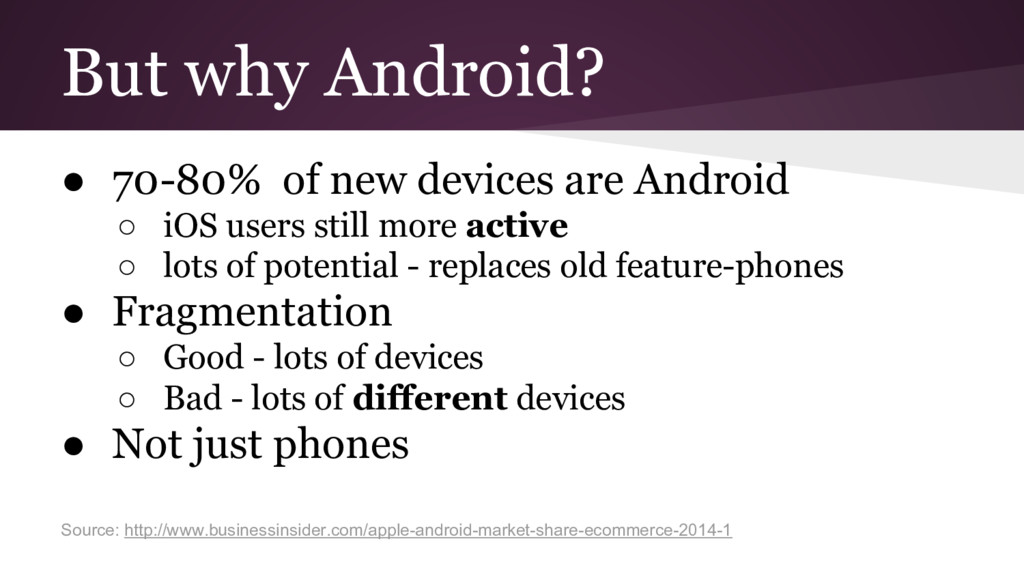 ◦ iOS users still more active ◦ lots of potential - replaces old feature-phones • Fragmentation ◦ Good - lots of devices ◦ Bad - lots of different devices • Not just phones Source: http://www.businessinsider.com/apple-android-market-share-ecommerce-2014-1