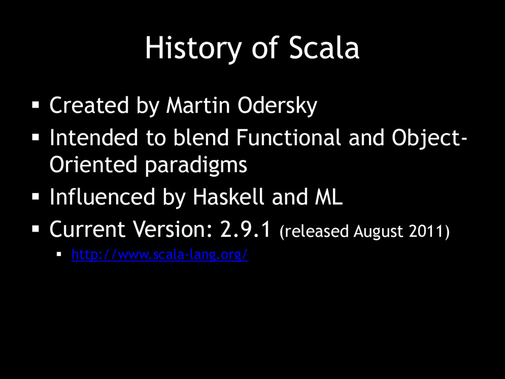 to blend Functional and Object- Oriented paradigms Influenced by Haskell and ML Current Version: 2.9.1 (released August 2011) http://www.scala-lang.org/