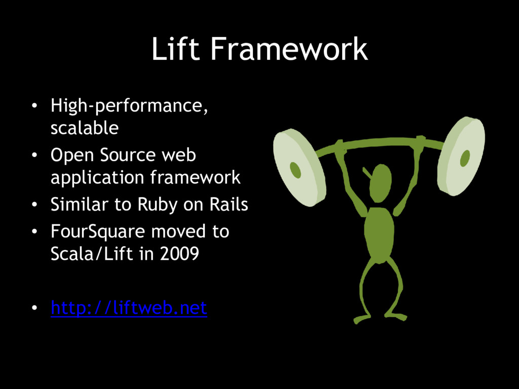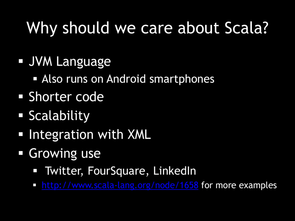 Also runs on Android smartphones Shorter code Scalability Integration with XML Growing use Twitter, FourSquare, LinkedIn http://www.scala-lang.org/node/1658 for more examples