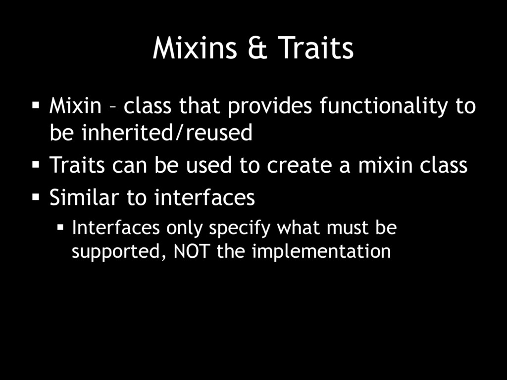 to be inherited/reused Traits can be used to create a mixin class Similar to interfaces Interfaces only specify what must be supported, NOT the implementation