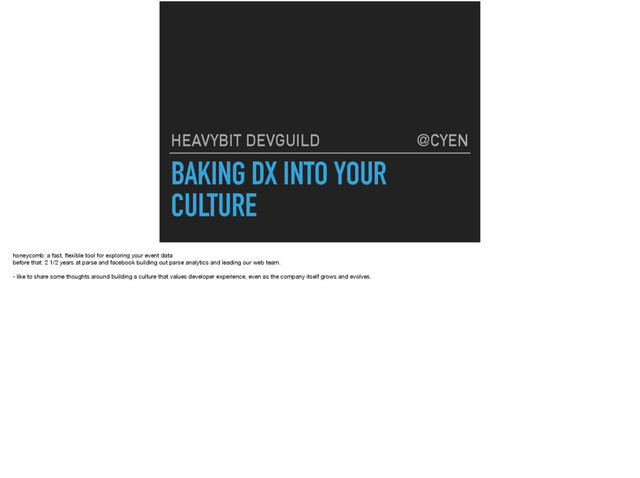 fast, flexible tool for exploring your event data before that: 2 1/2 years at parse and facebook building out parse analytics and leading our web team. - like to share some thoughts around building a culture that values developer experience, even as the company itself grows and evolves.