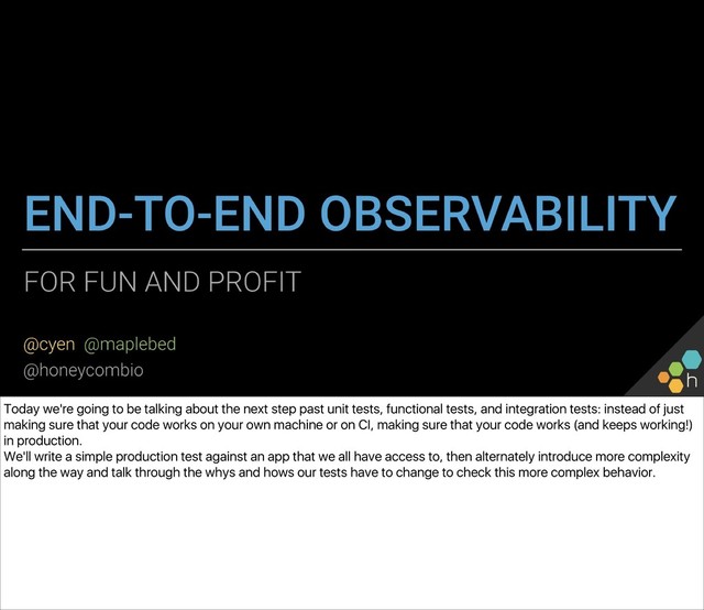 The class will write one together against a common API we can all access (a small server driving a Philips Hue bulb in the front of the room), and use the simple lightbulb server as a touchpoint from which to gauge the “correctness” of the system. You’ll also write an e2e check for the server, in whichever language and environment you prefer. Ben and Christine then explore capturing, visualizing, and alerting on results (e.g., What’s useful to capture? What metadata should we have along the way? What existing paging alerts are obsoleted by an effective e2e check?) and unveil a new, extended version of the lightbulb server, with multiple light bulbs representing a sharded backend. You’ll update your e2e checks for the more complicated architecture before exploring some real-world trade-offs of e2e checks.