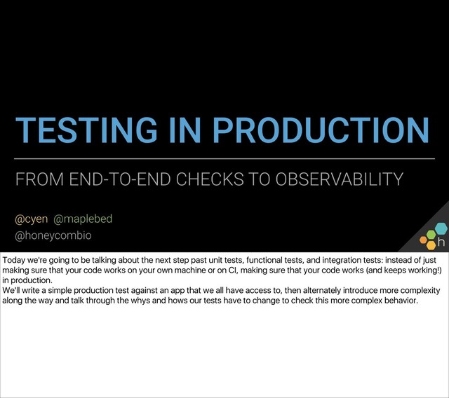 We've got unit tests, functional tests, and integration tests — but where are our tests for production? How we define (and check for!) "correct behavior" for a Rails app running in the wild?