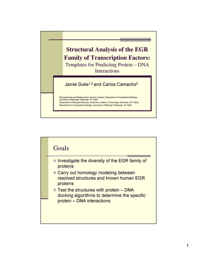 Templates for Predicting Protein – DNA Interactions Jamie Duke1,2 and Carlos Camacho3 1Bioengineering and Bioinformatics Summer Institute, Department of Computational Biology, University of Pittsburgh, Pittsburgh, PA 15261 2Department of Biological Sciences, Rochester Institute of Technology, Rochester, NY 14623 3Department of Computational Biology, University of Pittsburgh, Pittsburgh, PA 15261 Goals Investigate the diversity of the EGR family of proteins Carry out homology modeling between resolved structures and known human EGR proteins Test the structures with protein – DNA docking algorithms to determine the specific protein – DNA interactions