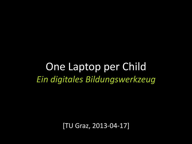 Gastvortrag vom 17. April 2013 über das One Laptop per Child Projekt im Zuge der "Gesellschaftliche Aspekte der Informatik" Vorlesung an der Technischen Universität Graz.