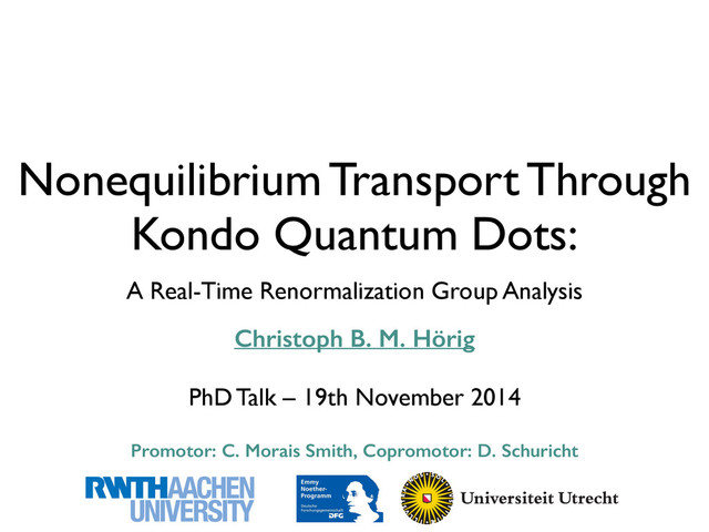 transport properties and current & conductance measurable • concentrate on many-body interaction ➡ focus: Kondo physiscs GaAs Confining Electrodes Gate Source Drain AlGaAs AlGaAs GaAs 2DEG Electron Density low-bias hI/hV map of the even region inside the dotted rectangle of Fig. 1c. This clearly displays two distinct regions, which (in anticipa- tion of our results) we associate with the singlet and triplet ground states. The possibility of gate-tuning the singlet–triplet splitting ET 2 ES was demonstrated previously both for lateral quantum dots18 and carbon nanotubes19, and may originate in an asymmetric coup- ling of the molecular levels to the electrodes20. The magnetic states cross sharply at a critical gate voltage Vc g <1:9 V. In the singlet region, a finite-bias conductance anomaly appears when Vb coincides with ET 2 ES ; this is due to a non-equilibrium Kondo effect involving excitations into the spin-degenerate triplet. This effect was recently studied in a carbon-nanotube quantum dot in the singlet state21 (see Supplementary Information). In the triplet region, two kinds of resonance are observed: a finite-bias hI/hV anomaly, which is interpreted as a singlet–triplet non-equilibrium Kondo effect that disperses like ES 2 ET in the Vg –Vb plane, and a sharp, zero-bias hI/hV peak, which is related to a partially screened spin-1 Kondo effect22, as indicated by the narrowness of the conduc- tance peak. To precisely identify these spin states, and justify our analysis in the framework of quantum criticality near the singlet–triplet crossing point, we present a detailed magneto-transport investigation of the even region. Owing to the high g-factor (g < 2) of C60 molecules, it is easy to lift the degeneracy of the triplet state for a C60 quantum dot using the Zeeman effect (see Supplementary Information). Figure 2b, d displays the evolution of the different conductance anomalies in the even region. Figure 2b shows hI/hV as a function of B and Vb for a constant gate voltage Vg chosen in the singlet region. A Zeeman-induced transition from the singlet state j0, 0æ to the lowest-m triplet state j1, 21æ occurs the clear level crossing in the conductance map. The splitting of triplet is also apparent, and the various spectroscopic lines are c sistent with the spin selection rules at both low and high magn field, where j0, 0æ and j1, 21æ are the respective ground states. In Fig. 2d we investigate the gate-induced singlet–triplet cross for constant magnetic field. In the singlet region, the Zeeman-s triplet states are clearly seen as three parallel lines, and the transit lines from the ground state j1, 21æ at higher gate voltage are agreement with the energy levels depicted in Fig. 2c, confirm the singlet to triplet crossing inside the even Coulomb diamo We note the absence of a large enhancement of the zero-bias c ductance at the singlet–triplet crossing in Figs 1d and 2b. Su features were, however, observed in previous experiments of vert semiconductor quantum dots4, where a field-induced orbital eff can be used to make the non-degenerate triplet coincide with singlet state, leading to a large Kondo enhancement of the cond tance that is intimately related to the existence of two screen channels23. In carbon nanotubes5, the Zeeman effect dominates o the orbital effect, so the transition involves the lowest-m triplet st only and Kondo signatures arise from a single channel, as in the c of well-balanced couplings of the two orbital states in the quant dot to the electrodes24. The lack of either type of singlet–triplet Kon effect in our data indicates that the predominant coupling is betw a single screening channel and one of the two spin states of the sing molecule quantum dot, leading to a Kosterlitz–Thouless quant phase transition at the singlet–triplet crossing, as predicted by theory2,3. Although the peculiar magnetic response associated w this transition is not directly accessible in our scheme, we demo strate that very specific characteristics of the Kosterlitz–Thou transition can be observed in transport. The basic factor in 100 nm 1 µm V b V g a b c d Odd Even Singlet Triplet E T – E S E S – E T Quantum critical point |A〉 lc l –30 –1.0 –0.5 |B〉 C 60 1 nm NATURE PHYSICS DOI: 10.1038/NPHYS1880 5.5 Vsd (mV) add (meV) 4N0 ∼ 180 +4 +8 ¬4 ¬8 S Gate B θ D 2 ¬2 0 8 a b c Fig. 3 f sys- sizes d be- Petta 1995; opar- dots wen- et al., ateral m dot reser- he de- and a FIG. 2. Lateral quantum dot device defined by metal surface electrodes. ͑a͒ Schematic view. Negative voltages applied to metal gate electrodes ͑dark gray͒ lead to depleted regions pins in few-electron quantum dots [R. Hanson (2007)] [N. Roch(2008)] [T. S. Jespersen (2011)] current How can we approach many-body transport from theory? source dot drain