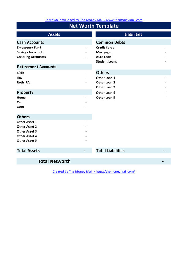 Savings Account/s - Mortgage - Checking Account/s - Auto Loan - Student Loans - Retirement Accounts 401K - Others IRA - Other Loan 1 - Roth IRA - Other Loan 2 - Other Loan 3 - Property Other Loan 4 - Home - Other Loan 5 - Car - Gold - Others Other Asset 1 - Other Asset 2 - Other Asset 3 - Other Asset 4 - Other Asset 5 - Total Assets - Total Liabilities - Template developed by The Money Mail - www.themoneymail.com Created by The Money Mail - http://themoneymail.com/ Liabilities Assets Net Worth Template Total Networth -