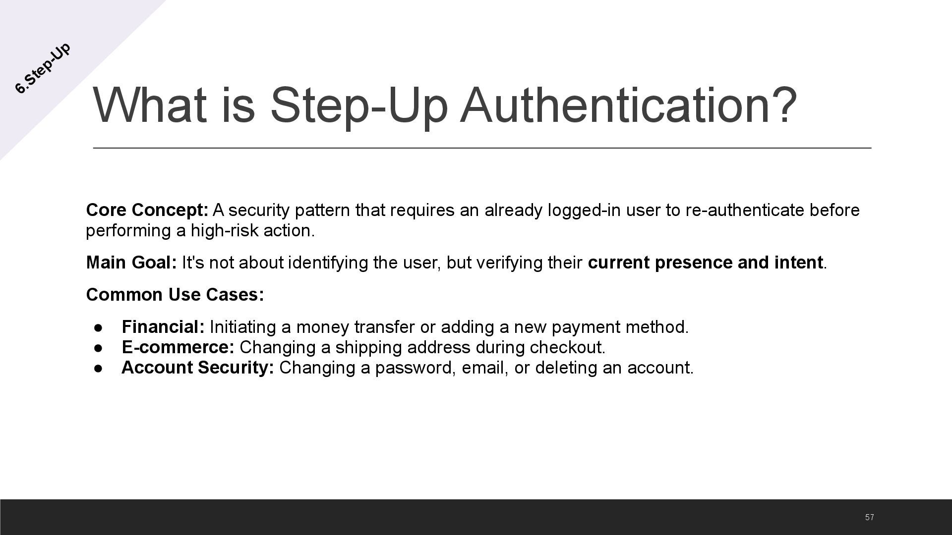 user to re-authenticate before performing a high-risk action. Main Goal: It's not about identifying the user, but verifying their current presence and intent. Common Use Cases: • Financial: Initiating a money transfer or adding a new payment method. • E-commerce: Changing a shipping address during checkout. • Account Security: Changing a password, email, or deleting an account. 57 6.Step-Up What is Step-Up Authentication?