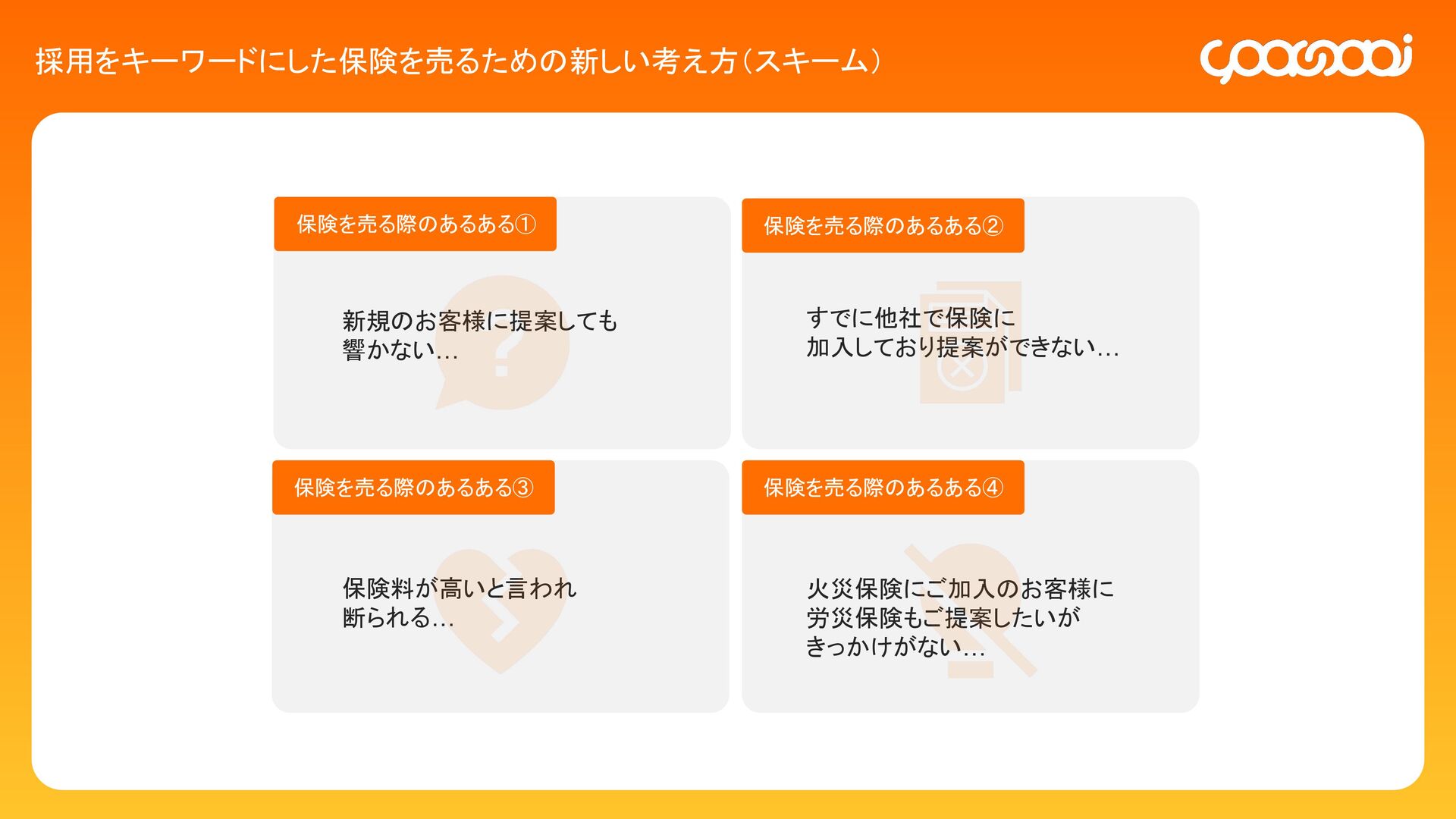 採用をキーワードにした保険を売るための新しい考え方(スキーム) 保険を売る際のあるある① 新規のお客様に提案しても 響かない… すでに他社で保険に 加入しており提案ができない… 保険料が高いと言われ 断られる… 火災保険にご加入のお客様に 労災保険もご提案したいが