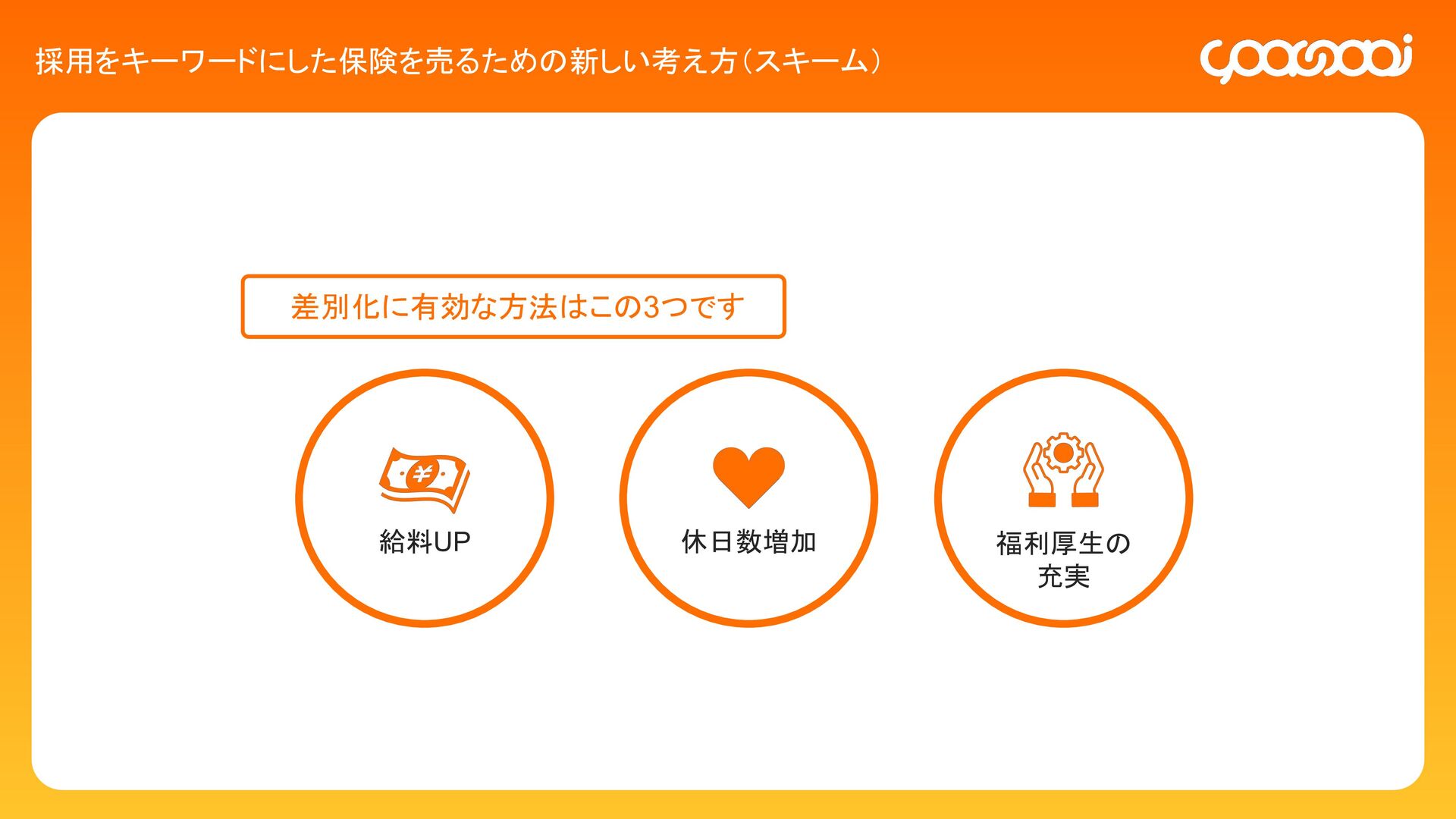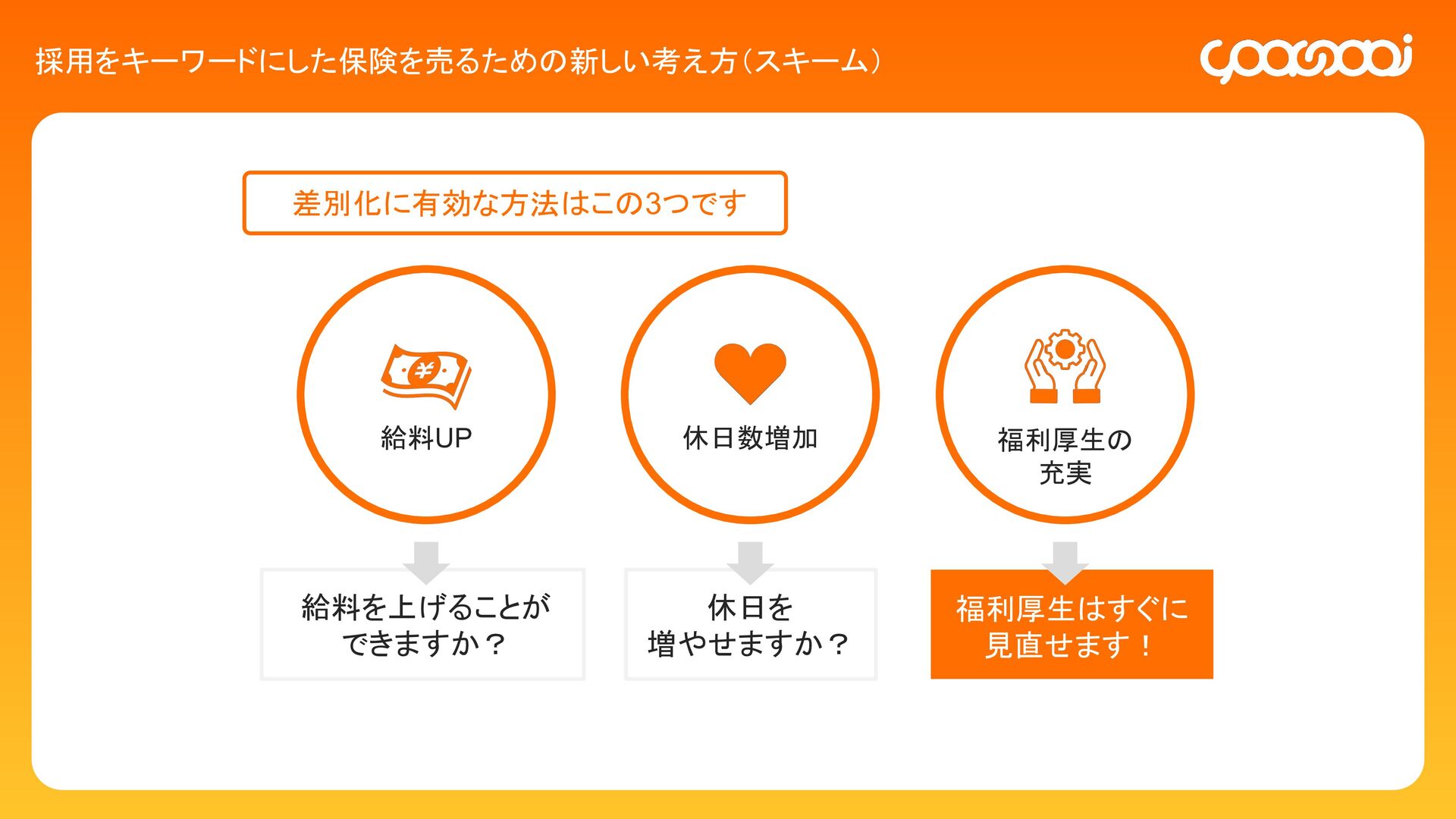 採用をキーワードにした保険を売るための新しい考え方(スキーム) 差別化に有効な方法はこの3つです 給料UP 休日数増加 福利厚生の 充実