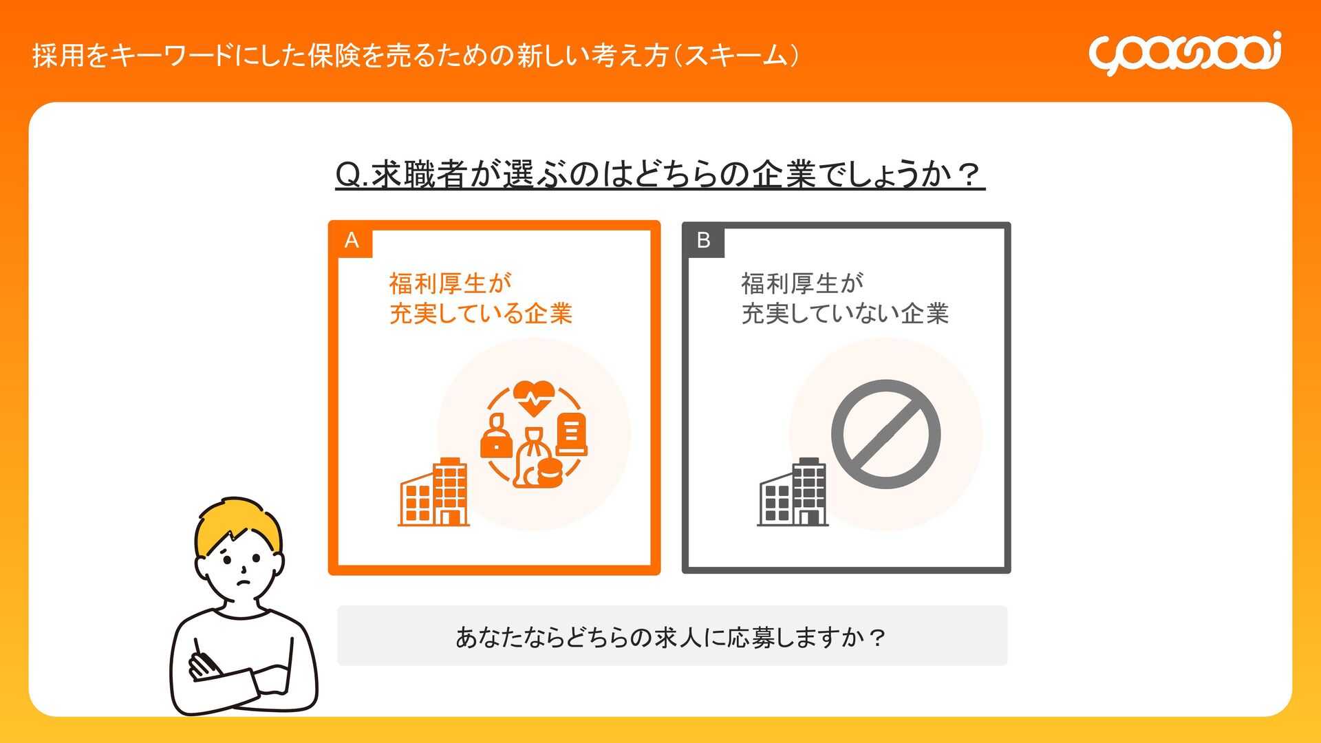 Q.求職者が選ぶのはどちらの企業でしょうか? あなたならどちらの求人に応募しますか? A 福利厚生が 充実している企業 B 福利厚生が 充実していない企業 採用をキーワードにした保険を売るための新しい考え方(スキーム)