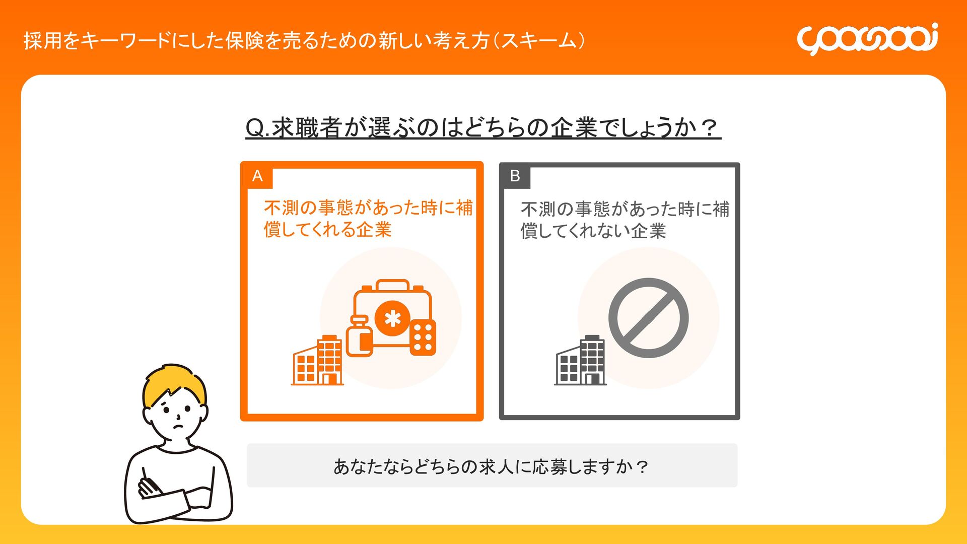 B Q.求職者が選ぶのはどちらの企業でしょうか? あなたならどちらの求人に応募しますか? A 不測の事態があった時に補 償してくれる企業 不測の事態があった時に補 償してくれない企業 採用をキーワードにした保険を売るための新しい考え方(スキーム)