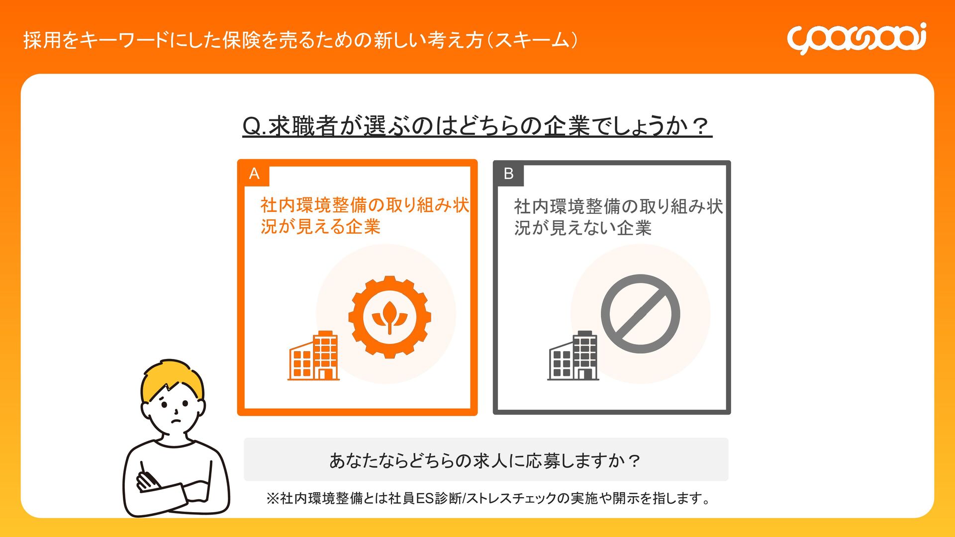 B Q.求職者が選ぶのはどちらの企業でしょうか? あなたならどちらの求人に応募しますか? A 社内環境整備の取り組み状 況が見える企業 社内環境整備の取り組み状 況が見えない企業 ※社内環境整備とは社員ES診断/ストレスチェックの実施や開示を指します。 採用をキーワードにした保険を売るための新しい考え方(スキーム)